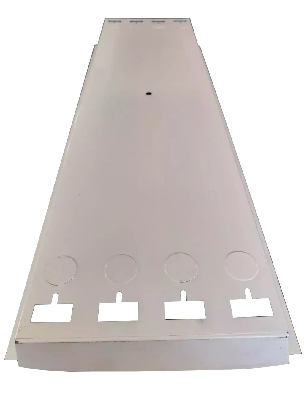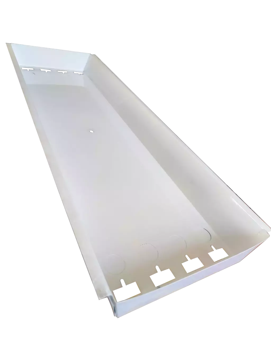 Calha comercial, perfil de sobrepor tripla. Chapa de aço fina frio, tratada quimicamente. Pintura eletrostática, com tinta poliéster na cor branca. Com alojamento para driver ou reator, caso o modelo da lâmpada a ser utilizado necessite.