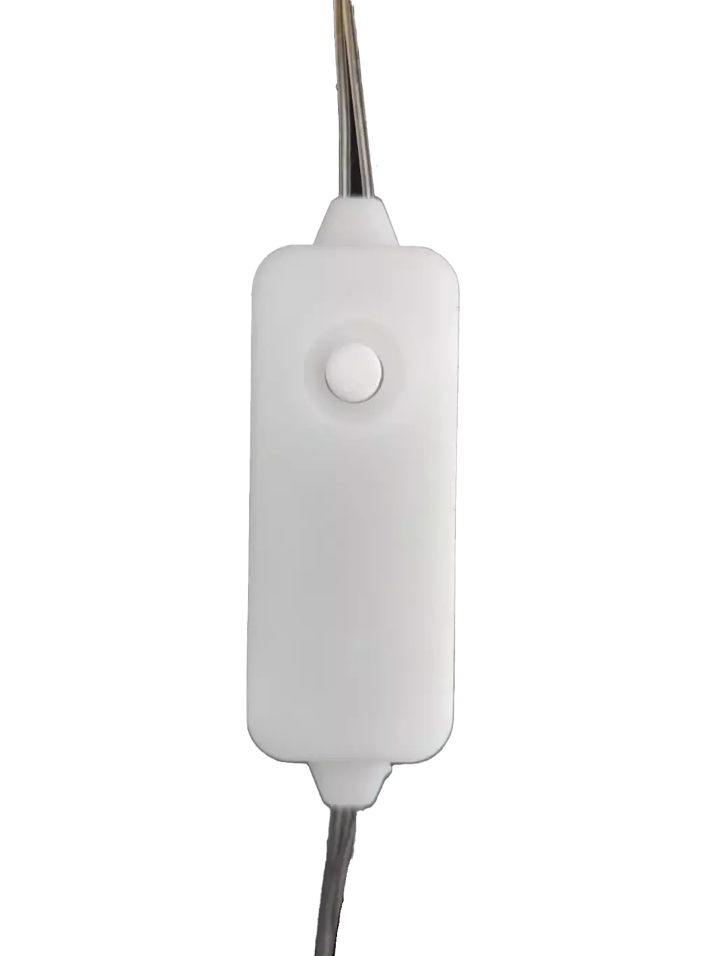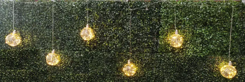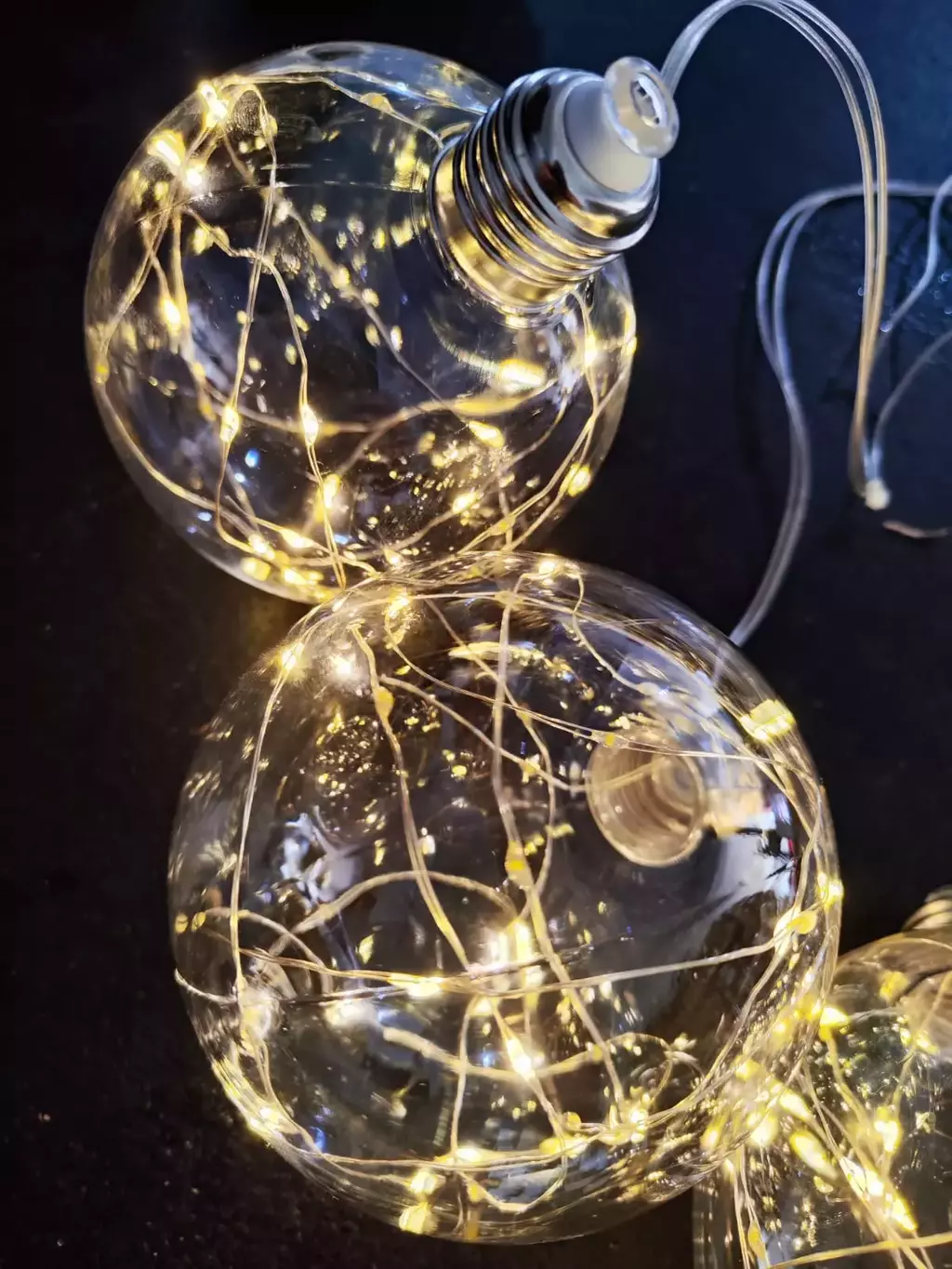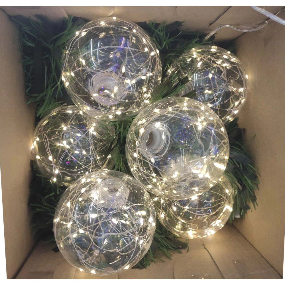Cordão decorativo com 6 bolas de 9,7cm de diâmetro, soquete metálico fake, 180 LEDs branco quente (3000K). Pode ser ligado na tomada residêncial.