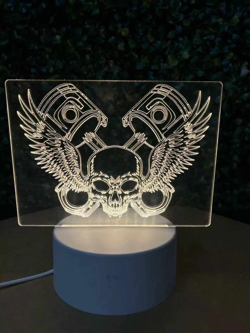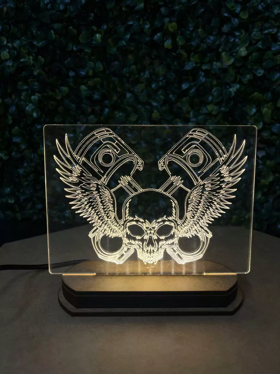 Placa de acrílico com gravação a laser, base LED 3000K para iluminação aconchegante ou com LED RGB para iluminação cheia de estilo, alimentação com cabo USB A que pode ser conectado a carregadores de celular (não incluso).