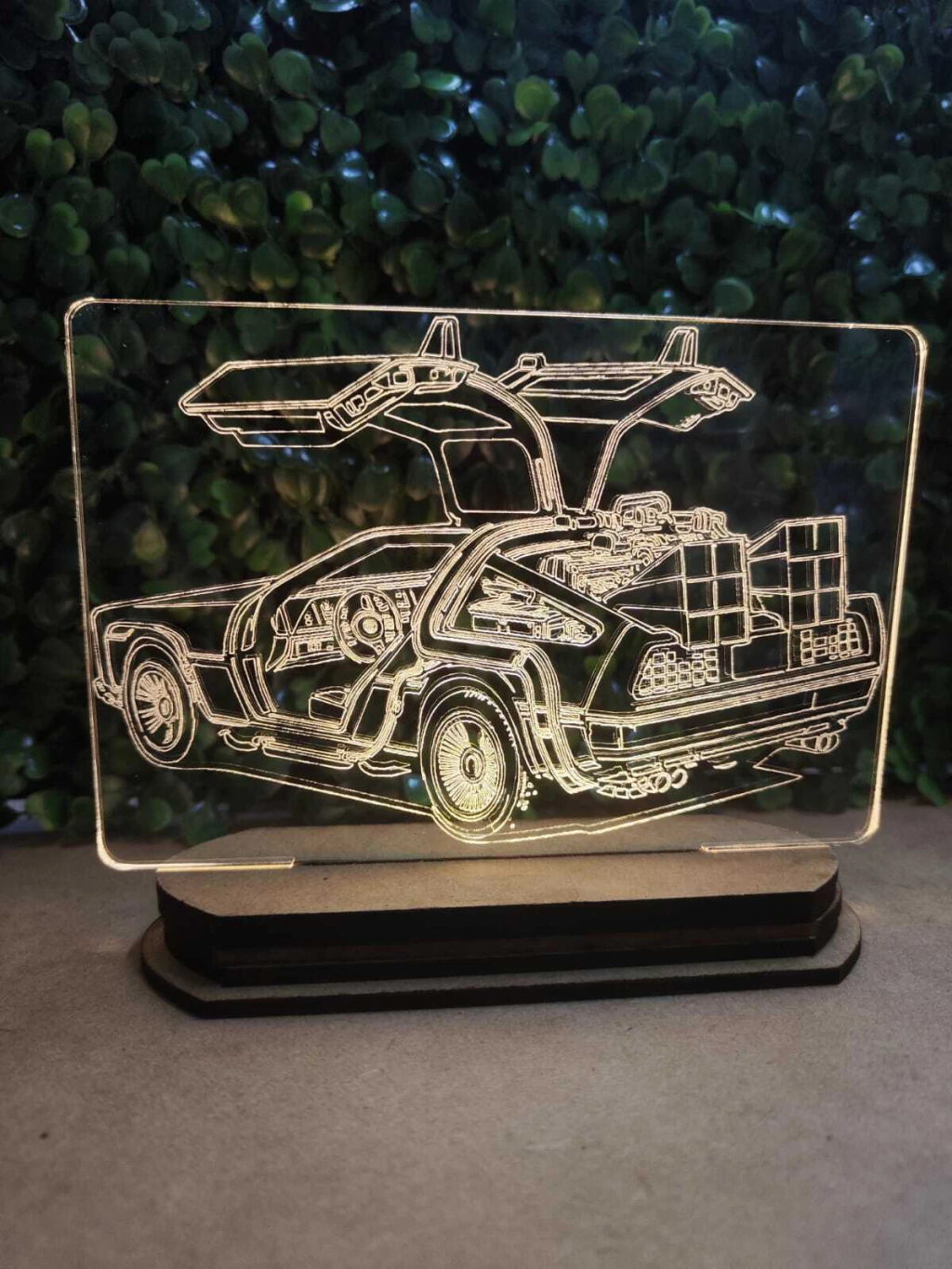 Placa de acrílico com gravação a laser do filme do glorioso carro DeLorean usado no filme "De volta para o futuro", base LED 3000K para iluminação aconchegante ou com LED RGB para iluminação cheia de estilo da placa, alimentação com cabo USB A que pode ser conectado a carregadores de celular (não incluso).