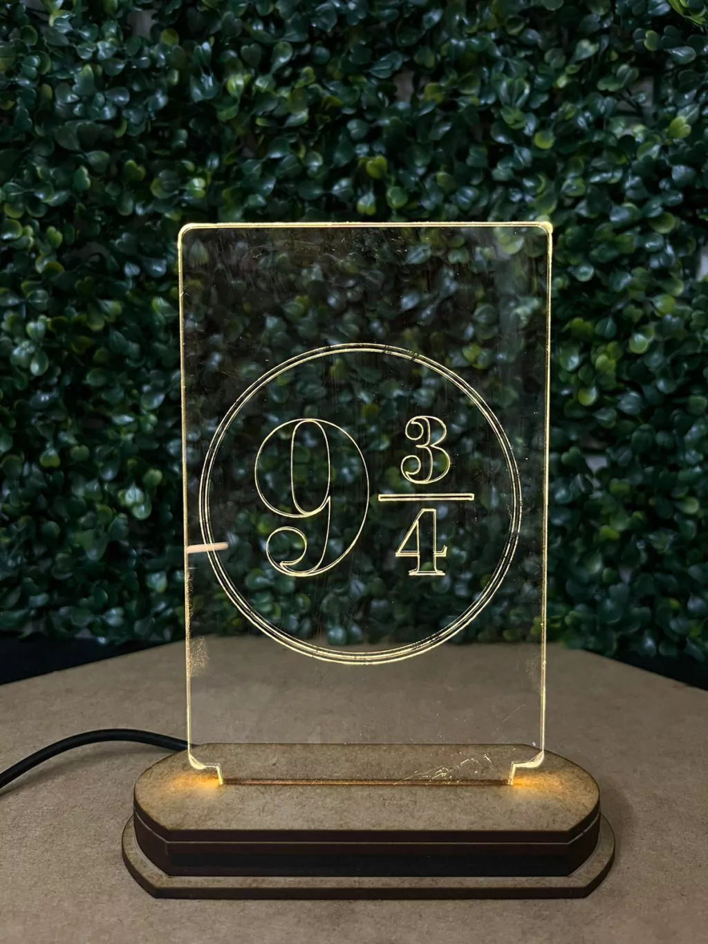 Placa de acrílico com gravação a laser, base LED 3000K para iluminação aconchegante ou com LED RGB para iluminação cheia de estilo, alimentação com cabo USB A que pode ser conectado a carregadores de celular (não incluso).