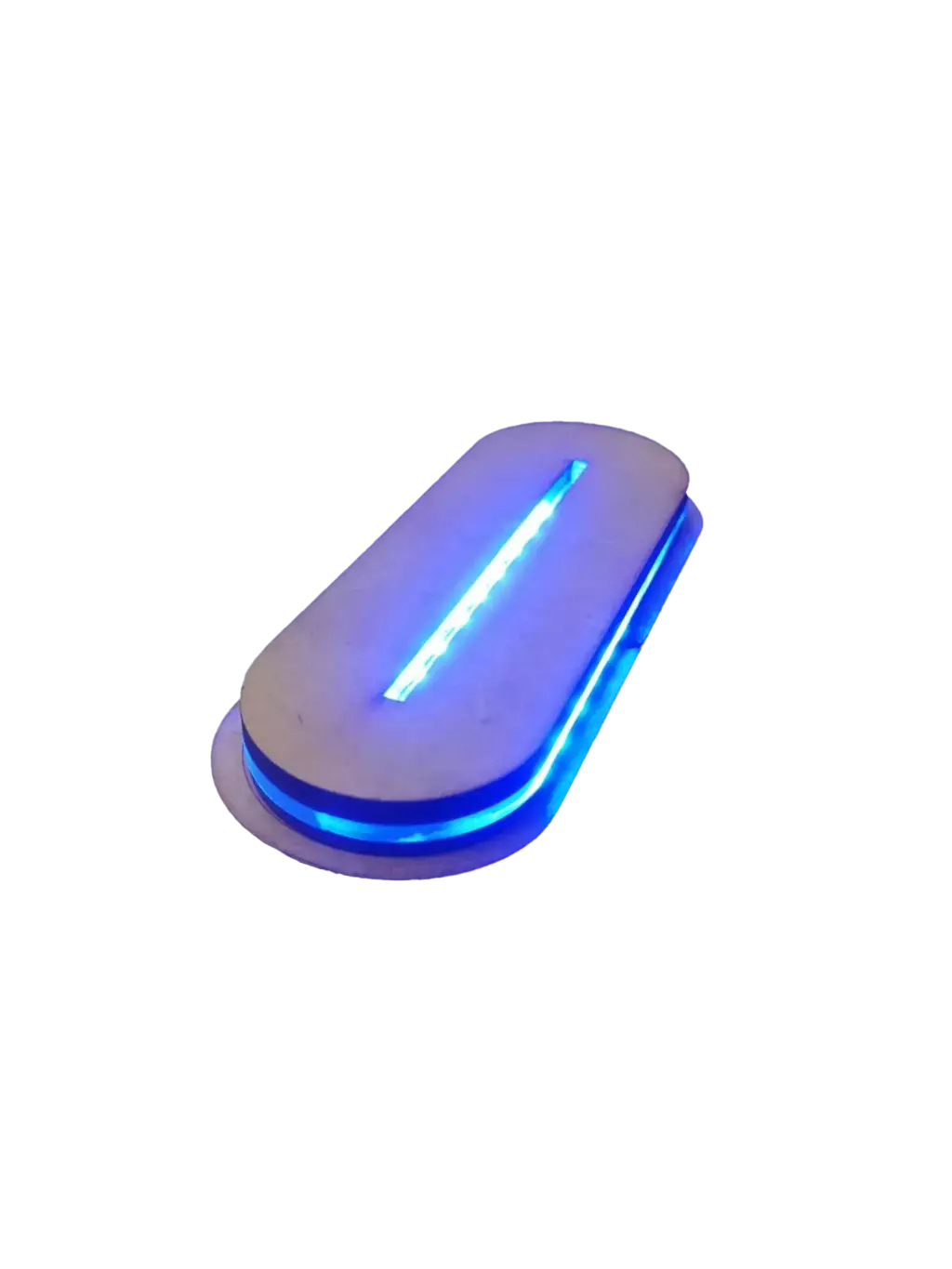 Placa de acrílico com gravação a laser, base LED 3000K para iluminação aconchegante, com LED RGB para iluminação cheia de estilo ou com LED exclusivo azul, alimentação com cabo USB A que pode ser conectado a carregadores de celular (não incluso).