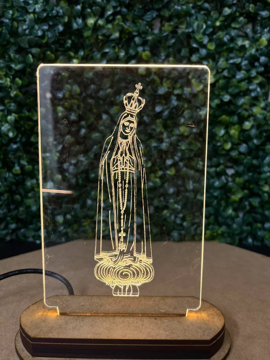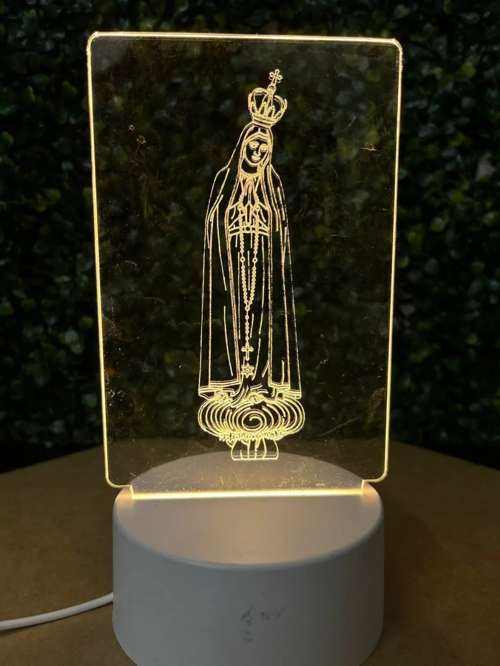 Placa de acrílico com gravação a laser, base LED 3000K para iluminação aconchegante ou com LED RGB para iluminação cheia de estilo, alimentação com cabo USB A que pode ser conectado a carregadores de celular (não incluso).