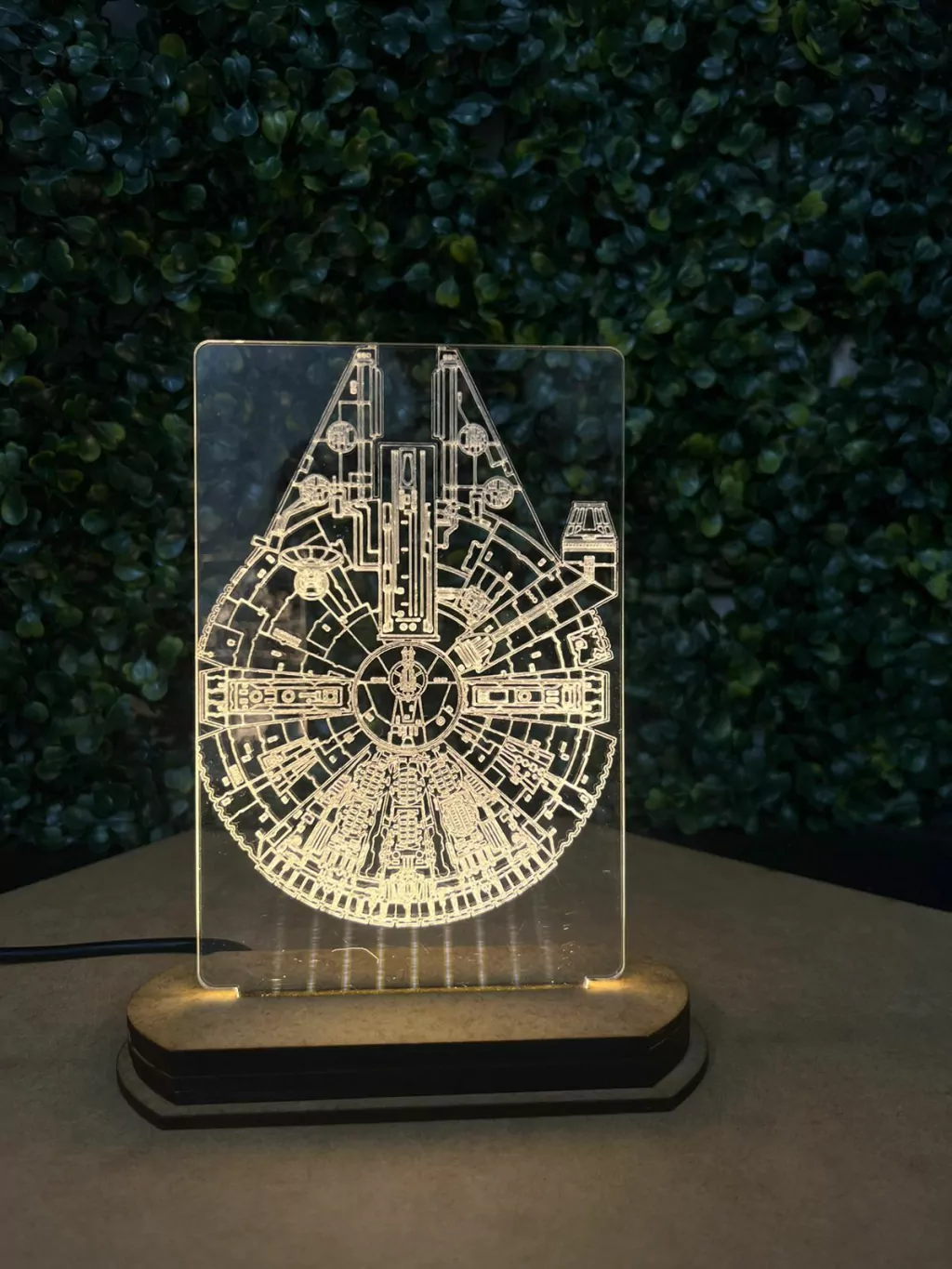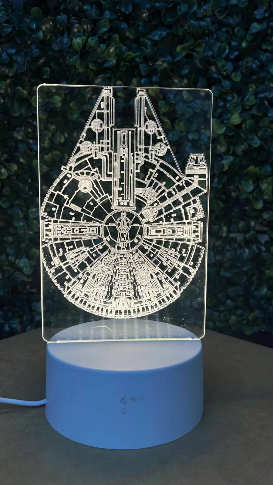 Placa de acrílico com gravação a laser, base LED 3000K para iluminação aconchegante ou com LED RGB para iluminação cheia de estilo da placa, alimentação com cabo USB A que pode ser conectado a carregadores de celular (não incluso).