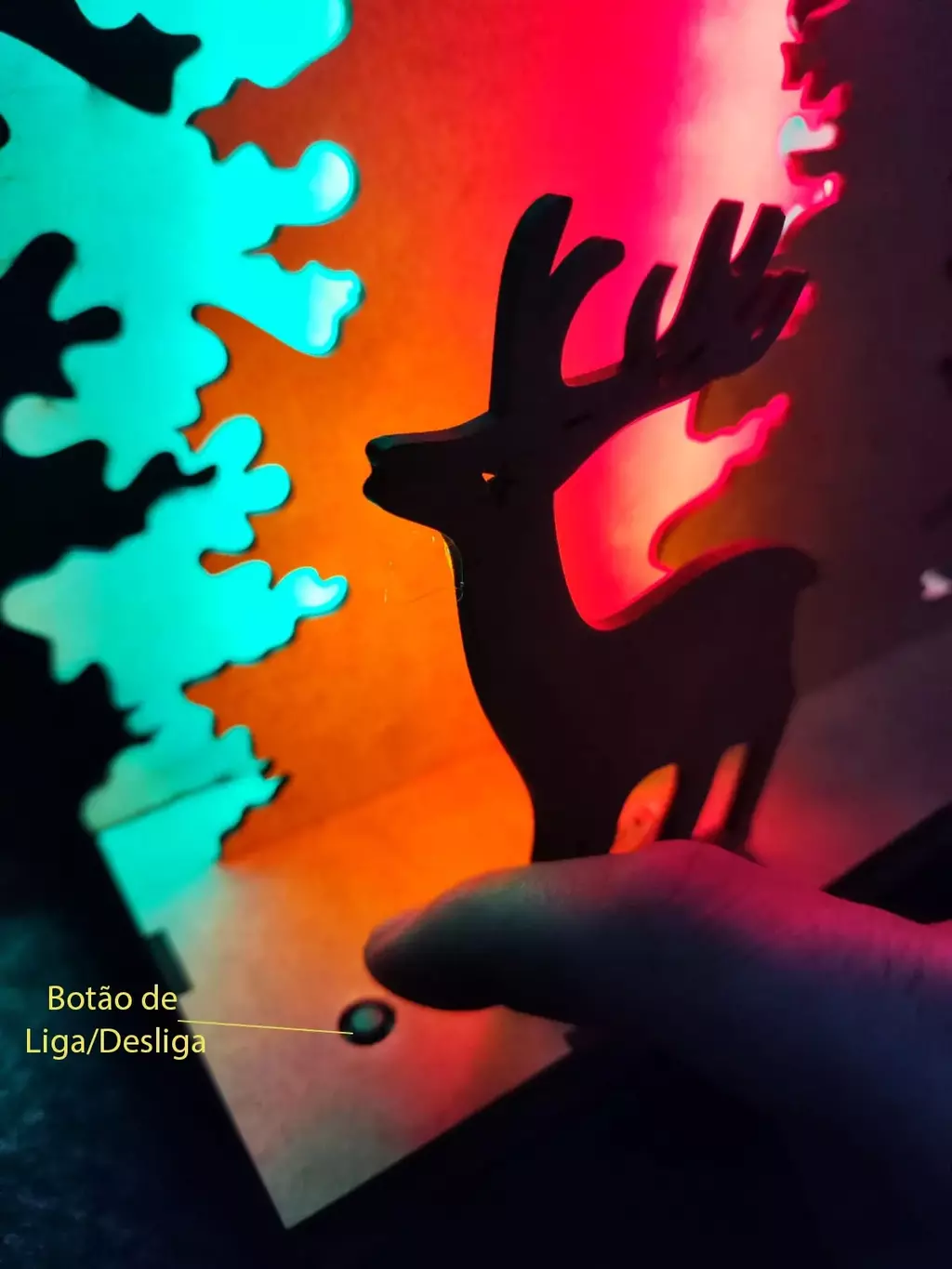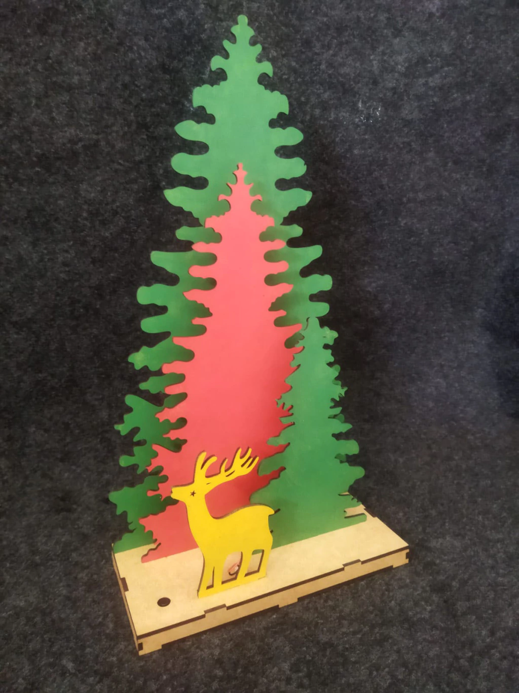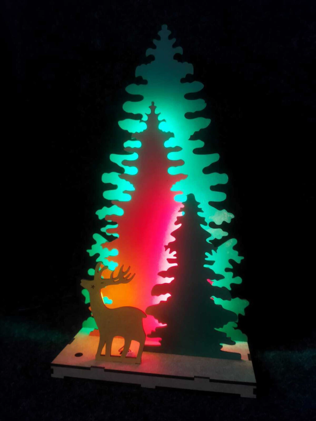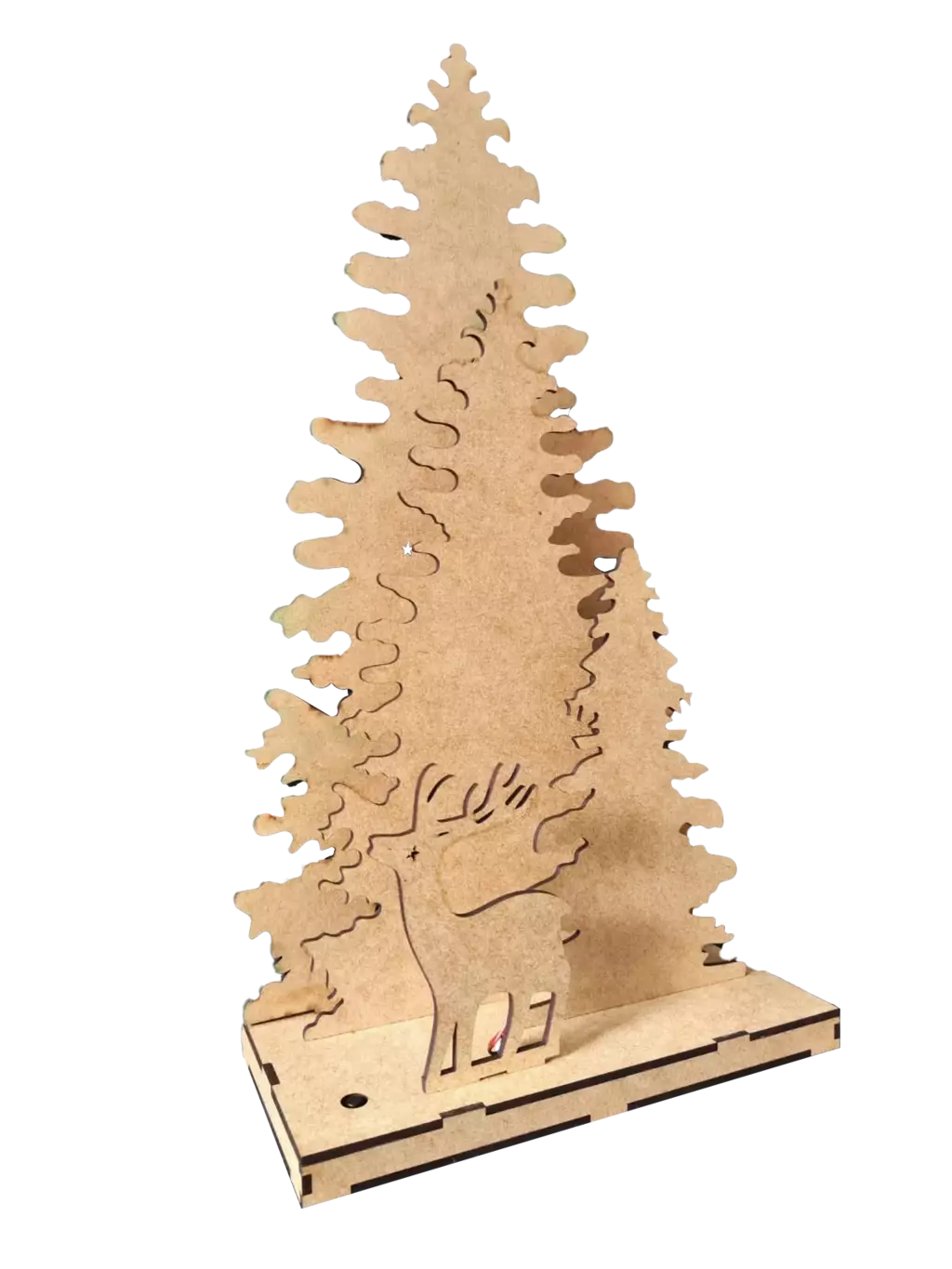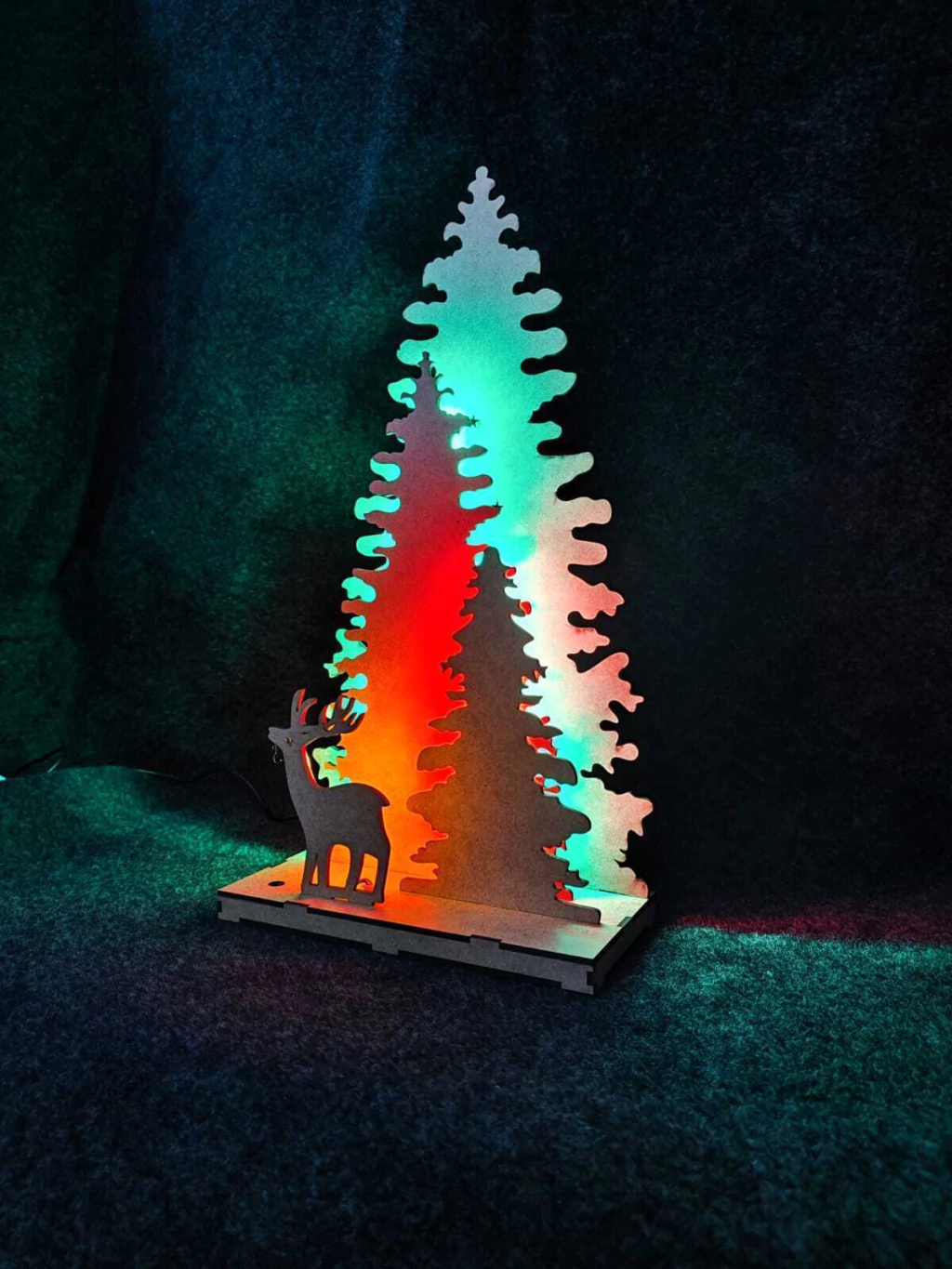 Opção 1 com MDF pintado, árvore maior na cor verde, árvore média na cor vermelha, arvore pequena na cor verde, Rena na cor âmbar, base cor natural. Iluminação LED entre árvore grande e média na cor verde, iluminação entre a árvore média e pequena na cor vermelha e atrás da Rena na cor âmbar.