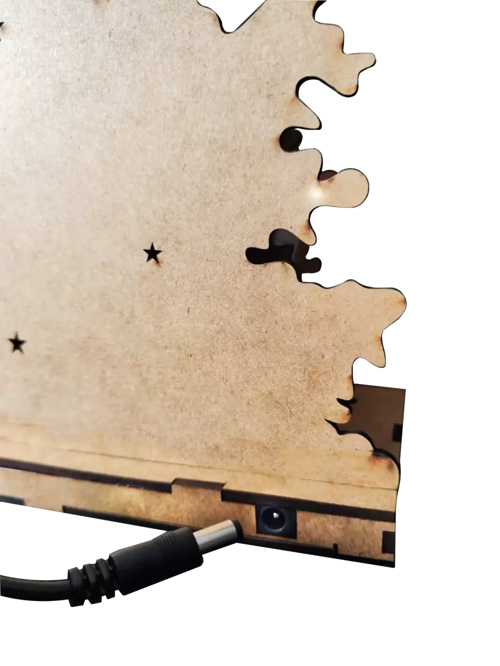 Luminária em MDF, com iluminação aconchegante de LED, base com botão liga-desliga e entrada para fonte de alimentação.