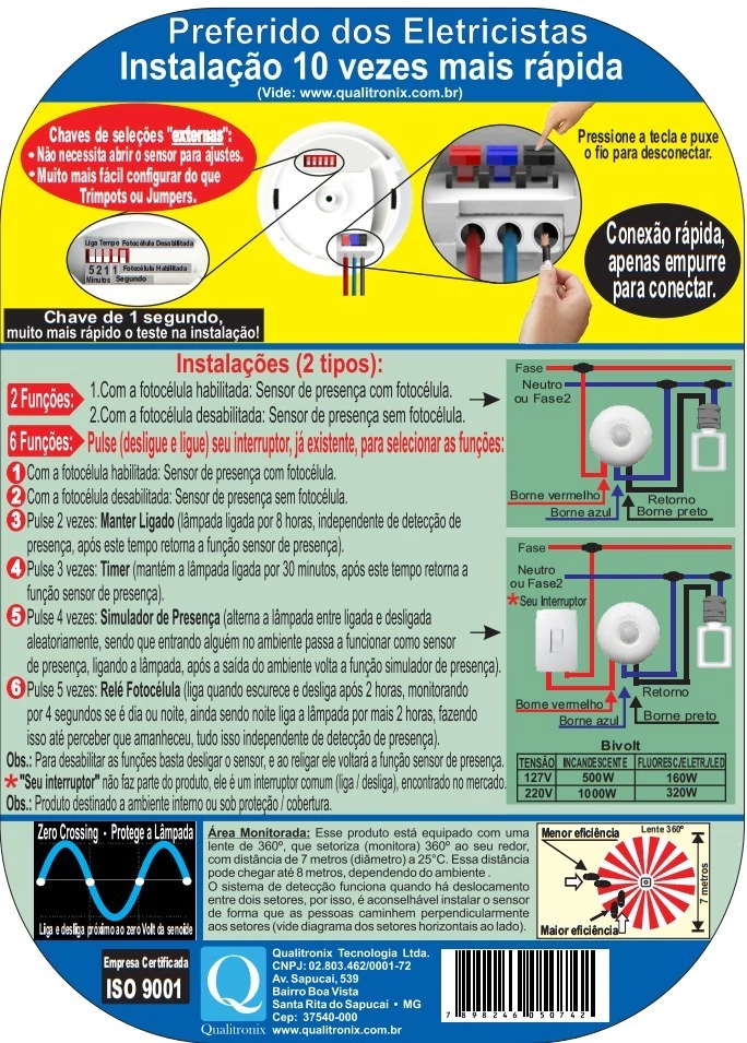 -Fotocélula: Ao detectar movimento o sensor ligará a lâmpada somente se o ambiente estiver escuro, entretanto, pode-se programar para atuar sempre que houver movimento, independente da claridade do ambiente.
